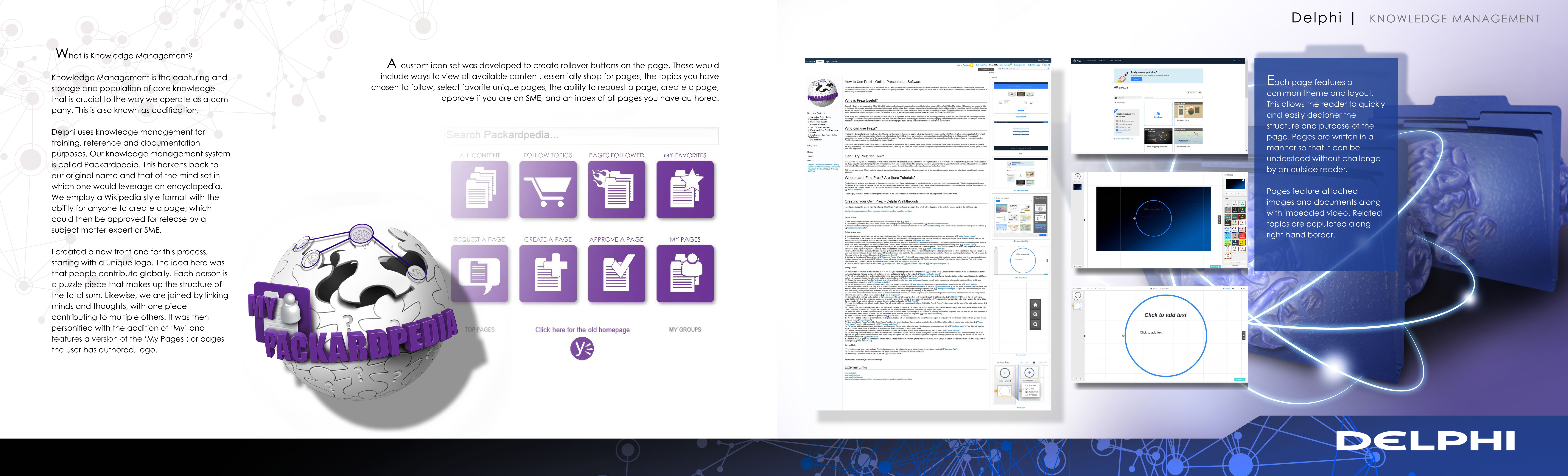 Delphi uses knowledge management for training, reference and documentation purposes. Our knowledge management system is called Packardpedia. This harkens back to our original name and that of the mind-set in which one would leverage an encyclopedia. We employ a Wikipedia style format with the ability for anyone to create a page; which could then be approved for release by a subject matter expert or SME.