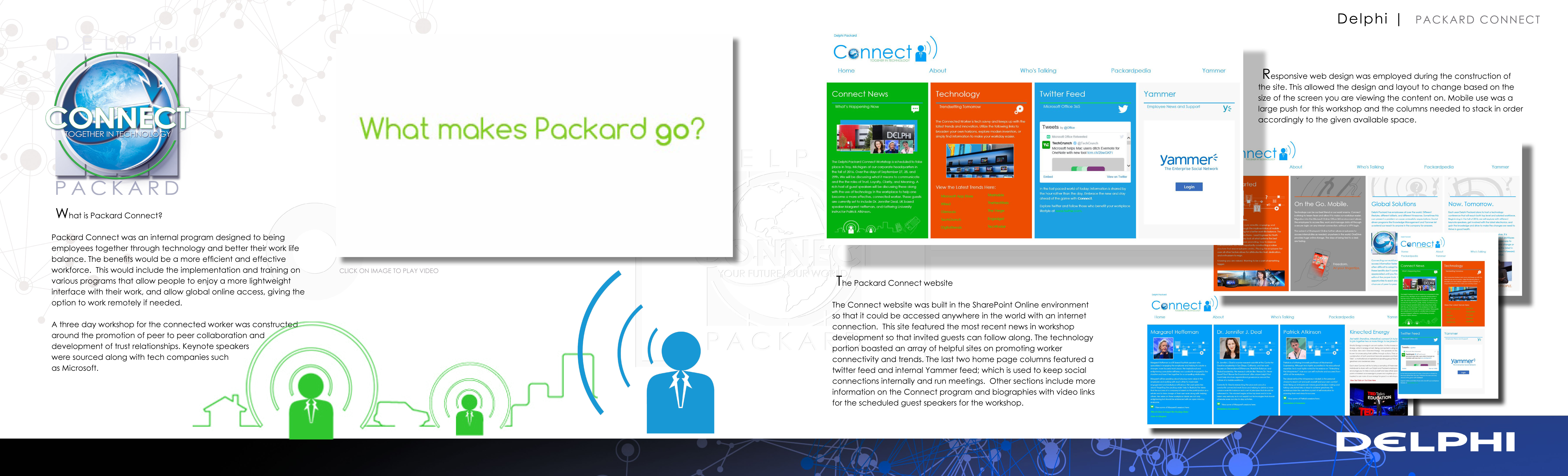 The Packard Connect website was built in the SharePoint Online environment so that it could be accessed anywhere in the world with an internet connection. This site featured the most recent news in workshop development so that invited guests can follow along. The technology portion boasted an array of helpful sites on promoting worker connectivity and trends. The last two home page columns featured a twitter feed and internal Yammer feed; which is used to keep social connections internally and run meetings. Other sections include more information on the Connect program and biographies with video links for the scheduled guest speakers for the workshop.