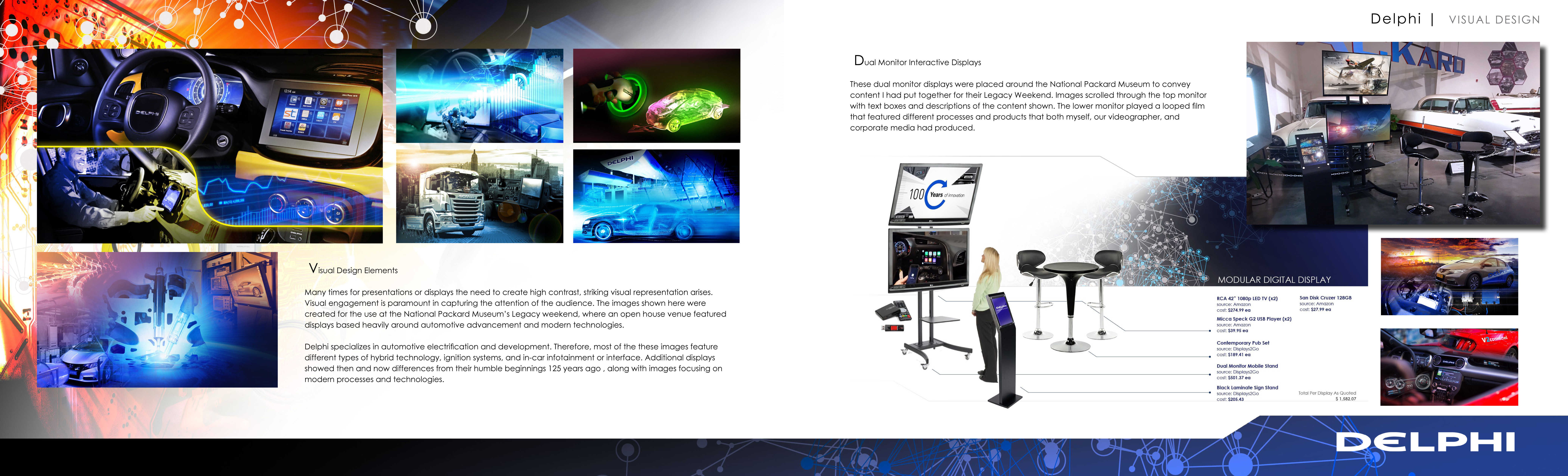 Delphi specializes in automotive electrification and development. Therefore, most of the these images feature different types of hybrid technology, ignition systems, and in-car infotainment or interface. Additional displays showed then and now differences from their humble beginnings 125 years ago , along with images focusing on modern processes and technologies.