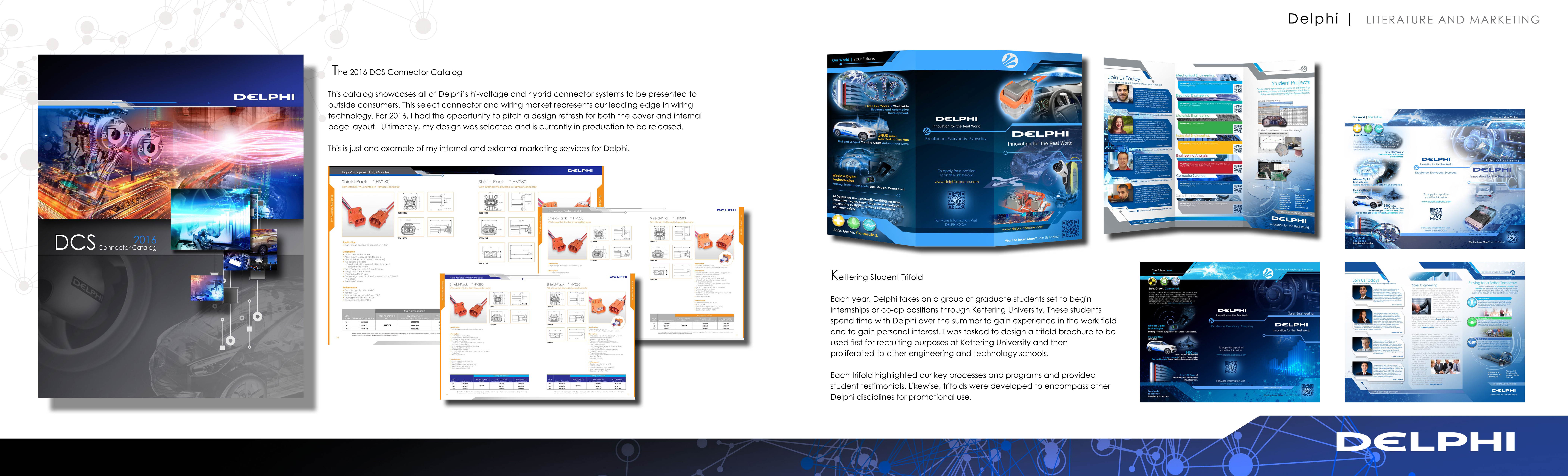 Each year, Delphi takes on a group of graduate students set to begin internships or co-op positions through Kettering University. These students spend time with Delphi over the summer to gain experience in the work field and to gain personal interest. I was tasked to design a trifold brochure to be used first for recruiting purposes at Kettering University and then proliferated to other engineering and technology schools.