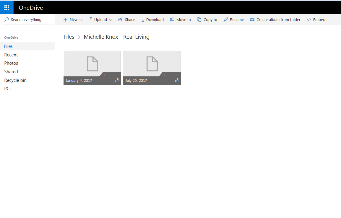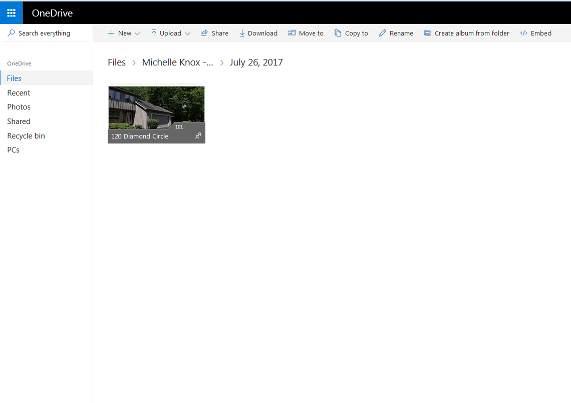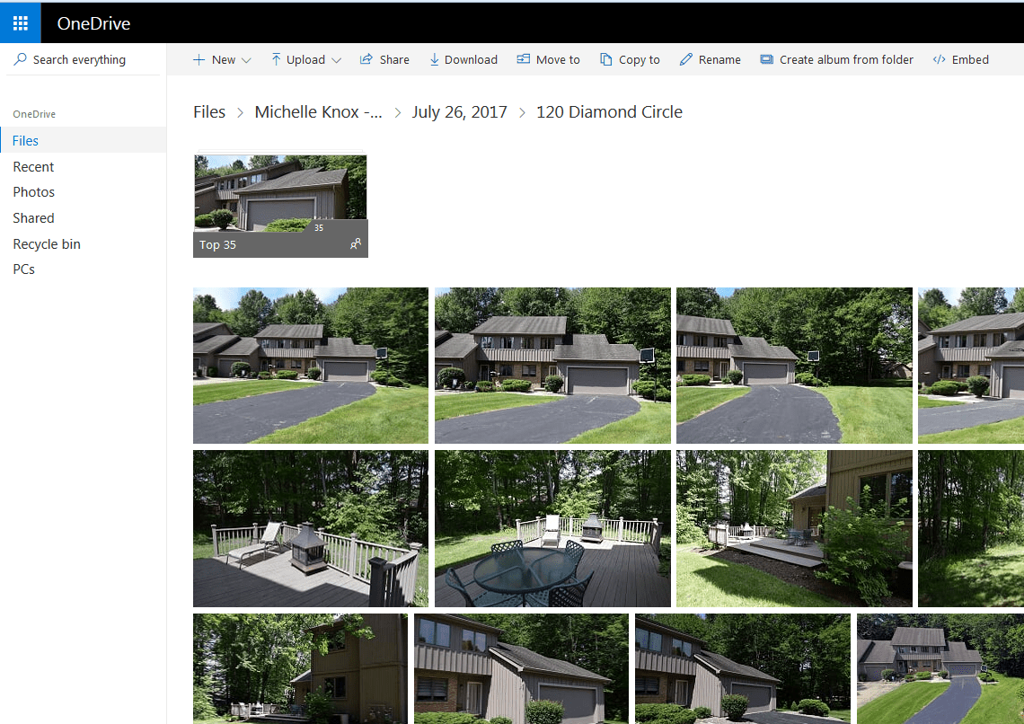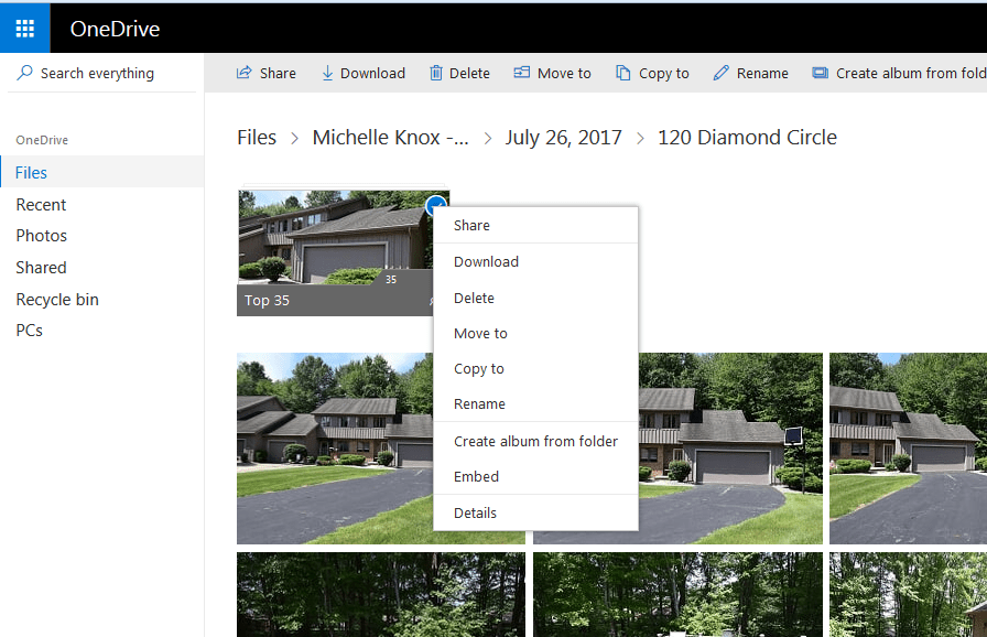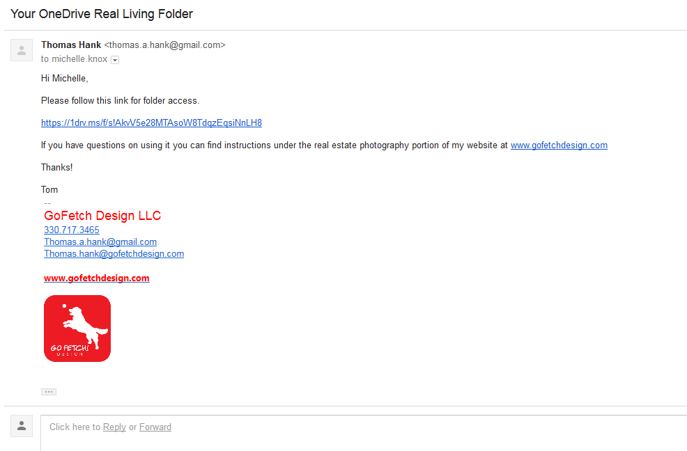 You will receive an email from a GoFetch Design LLC representative with the link to your personal OneDrive folder. We will be following along using this example with our good friend and client Michelle. Official introduction instructions are usually included in your first email and can also be found at any time on this site under the Realty Photography section. Make sure you save this address in your favorites menu or create a shortcut for easy access. You may also choose to download the OneDrive software to your computer or phone to create a live shared folder on your desktop. Visit the link on the introduction pages for more information.