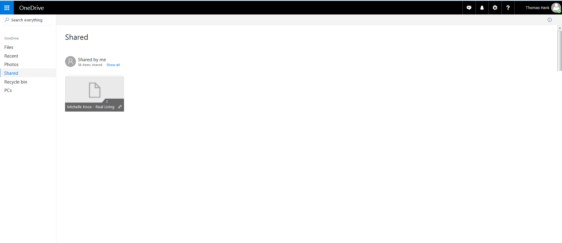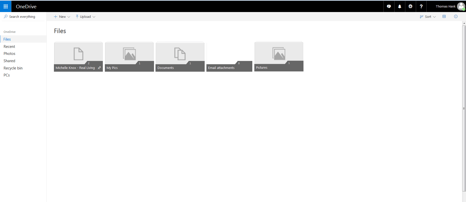 If you are logging into OneDrive for the first time, it will likely take you to your dashboard. Here you will see your name in the upper right hand corner once logged in. The menu to your left gives you multiple options of where files may be located. We will only be dealing with two possible locations here: “Files” or “Shared”. In this instance, Michelle’s file is listed under the Files menu. By default, she will also see a MyPics, Documents, Email Attachments, and a Pictures foler. These are automatically populated by OneDrive and we will not be using these; likewise your files will ONLY be found in the marked file by your name and place of business.