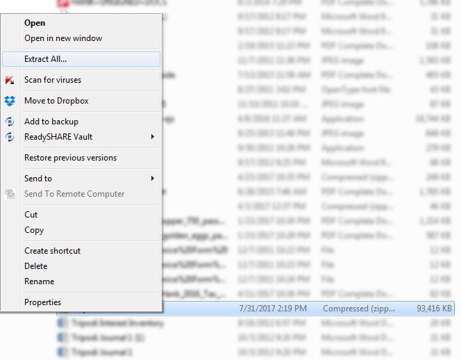 Right click on your Zip folder and select “Extract All”. Some operating systems may already show an Extract all option in the file browser menu. Either option is fine.