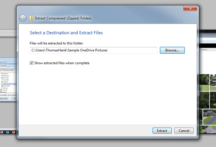 Chose an existing file or the “Make New Folder” option to create a new folder for these to extract to. Here you will see the pictures are to be distributed into the “Sample OneDrive Pictures” folder for this walk-through. Create new folders on your direct desktop for easiest access. If you forget where you saved them, simply use the search tool in the startup menu to locate the files.